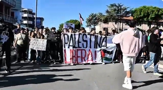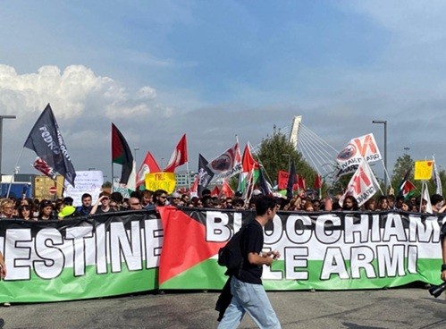 Meanwhile strikes and blockades continue from one end of Italy to the other – last Wednesday the “No Harbour for Genocide” campaign successfully blocked jet fuel from being loaded onto a ship in the port of Taranto en route to Israel. A general strike was called in Trieste when an Israeli ship arrived at the port. Palestine Action activists chained themselves to the gates of arms manufacturer Leonardo near Milan. Something is happening every day all over the country.